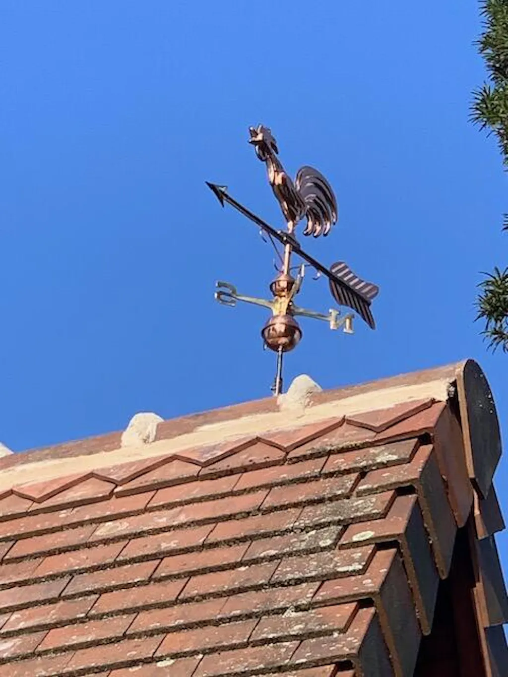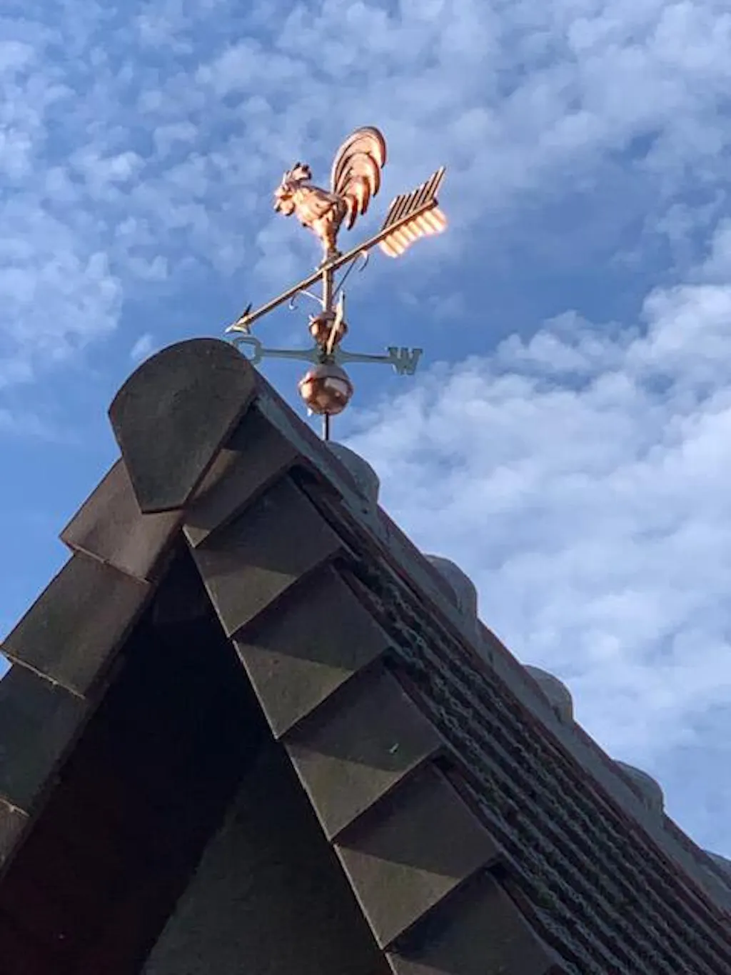 Die Wetterfahne dreht sich immer in den Wind, so bietet sie keine Angriffsfläche und bleibt sicher und unbeschadet auf dem Dach.